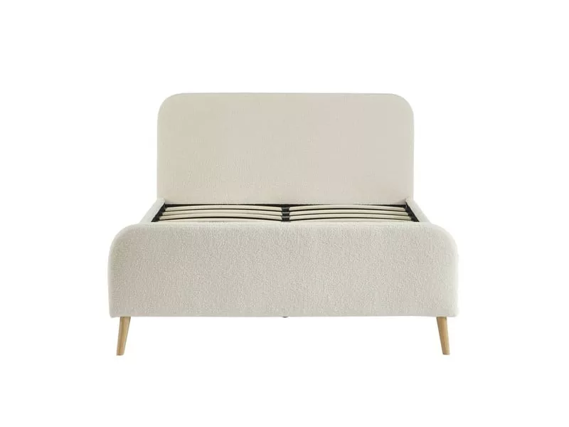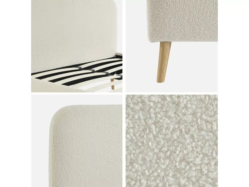 Lit avec sommier à lattes et tête de lit rembourrée 2 places bouclette crème 140 x 190 cm – finn