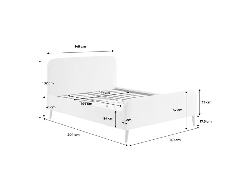 Avec ses courbes, son revêtement en bouclette toute douce et sa jolie teinte crème, le lit Finn transforme votre chambre en cocon de bien-être. Ce lit deux places au style contemporain allie charme et confort, pour des nuits paisibles et des matins tout doux. Sa structure solide en bois d’eucalyptus et contreplaqué lui assure une belle longévité, tandis que son sommier à lattes et sa tête de lit rembourrée invitent à la détente, que ce soit pour dormir, lire ou rêvasser. Parfait pour réchauffer l’ambiance et offrir une vraie bulle de confort au quotidien, Finn a tout pour devenir la pièce maîtresse de votre chambre.