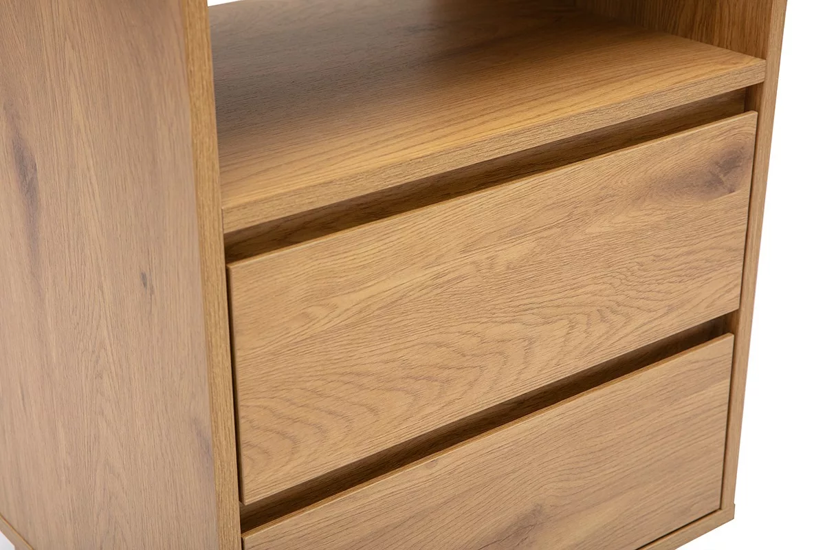 Côté praticité, ce meuble a tout pour plaire. Il intègre deux tiroirs spacieux, parfaits pour organiser vos documents, accessoires du quotidien, textiles, fournitures ou objets personnels. Au-dessus, une niche ouverte permet d’exposer vos plus beaux objets décoratifs, de déposer vos lectures du moment ou d’installer un panier de rangement supplémentaire. Cette combinaison tiroirs + niche ouverte assure un rangement polyvalent et toujours stylé.
