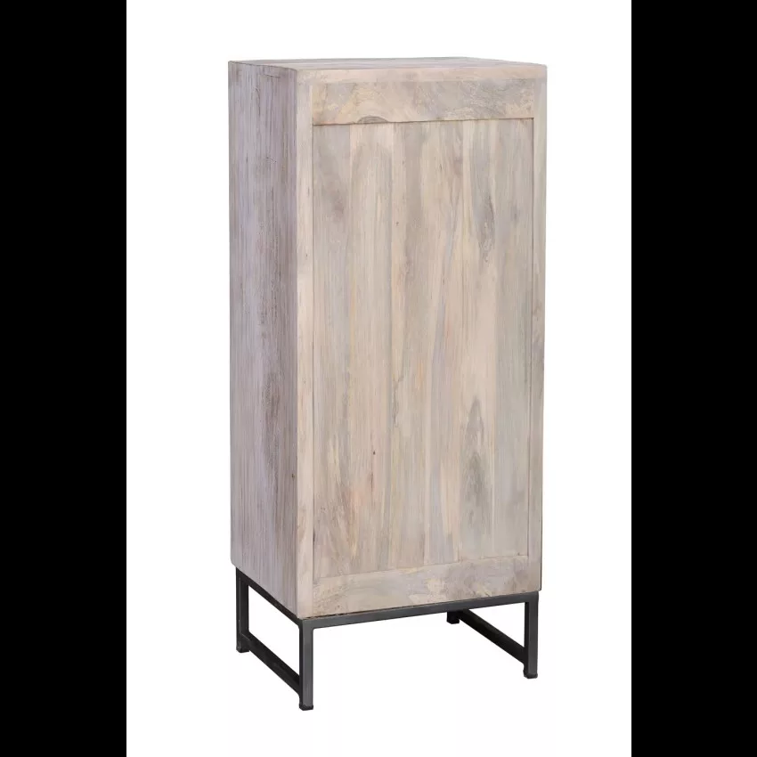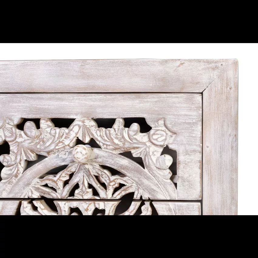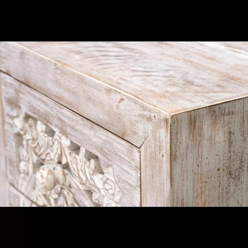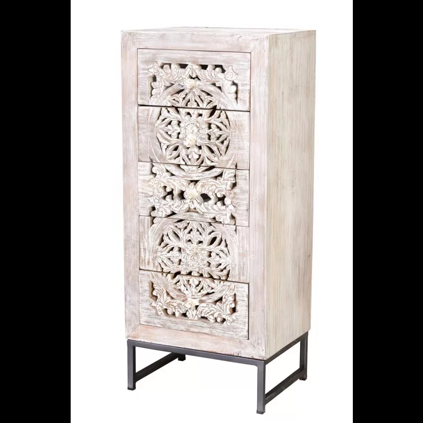 Sinfonier 5 tiroirs en bois de manguier et base en fer. Couleur : blanc vieilli et base grise. Caractéristiques : Les portes sont sculptées à la main. Dimensions : 105 cm de haut x 45 cm de large x 35 cm de profondeur. poids : 27 kg dimensions de l’emballage : 109x51x42cm Étant donné qu’il s’agit d’un meuble en bois naturel et fabriqué à la main, il peut conserver ses nœuds et ses veines d’origine et peut donc présenter des différences en ce qui concerne la couleur.