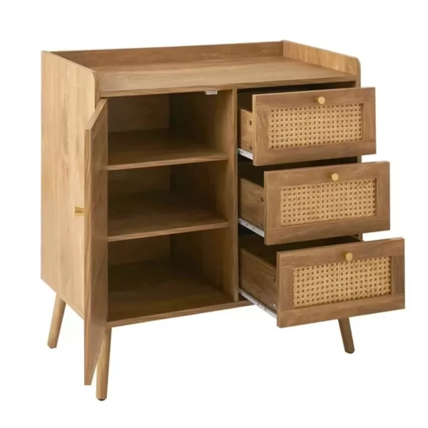 Palmo - Commode 1 porte 3 tiroirs avec façades rotin et pieds en bois L80 cm