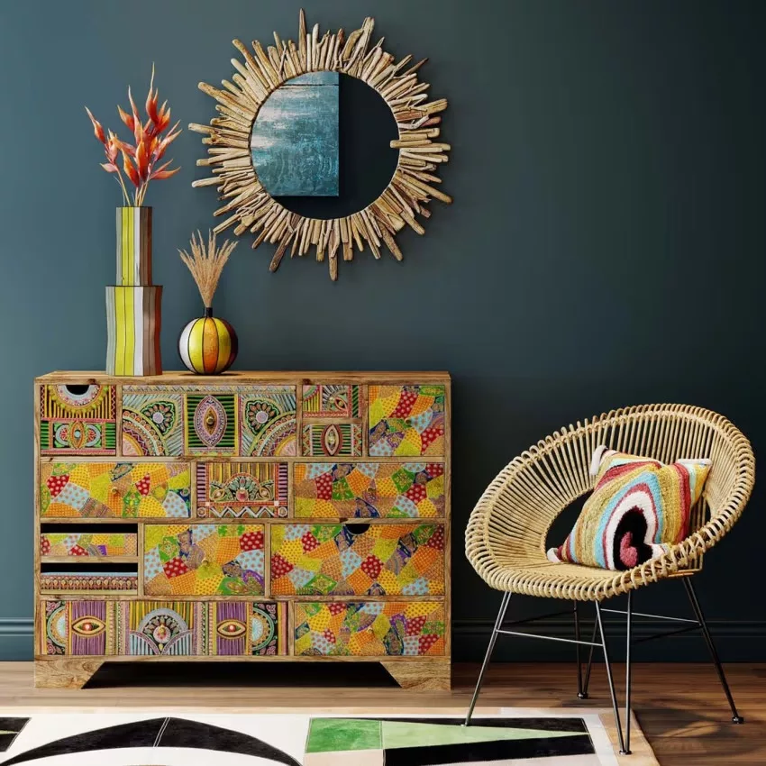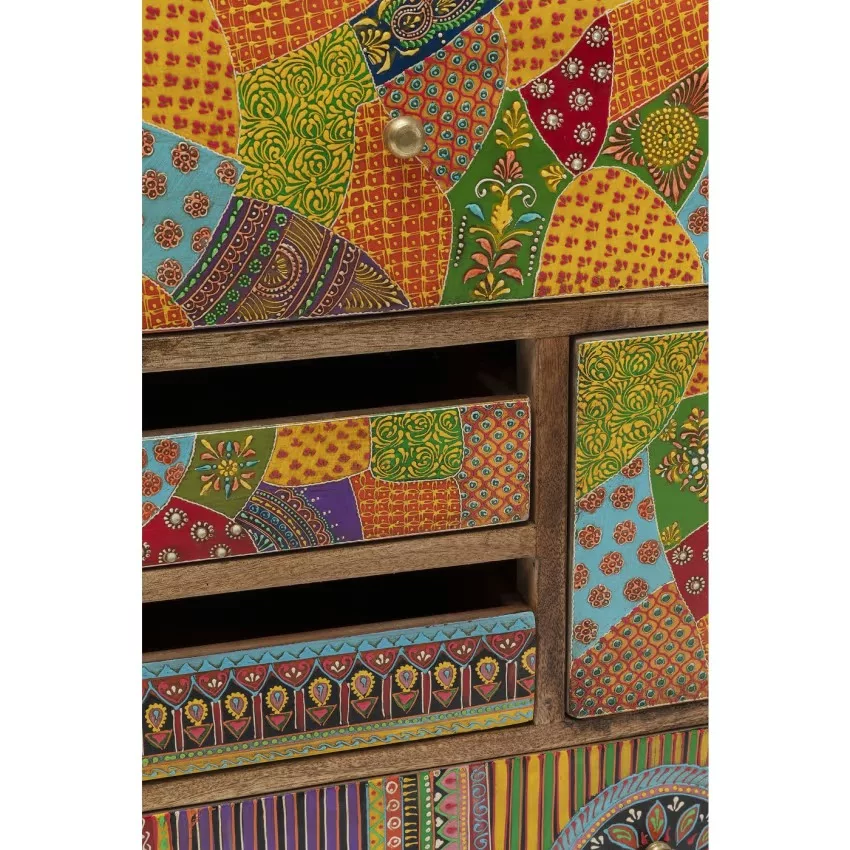Cette commode en bois allie le style ethnique de motifs mandala au classique patchwork bien connu en couture, une alliance à la fois intrigante et vibrante. Ses poignées rondes sont discrètement intégrées dans l’arc-en-ciel de couleurs. Elle dispose de tiroirs de tailles diverses et variées pour un rangement optimal.