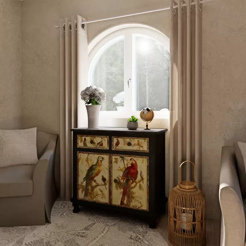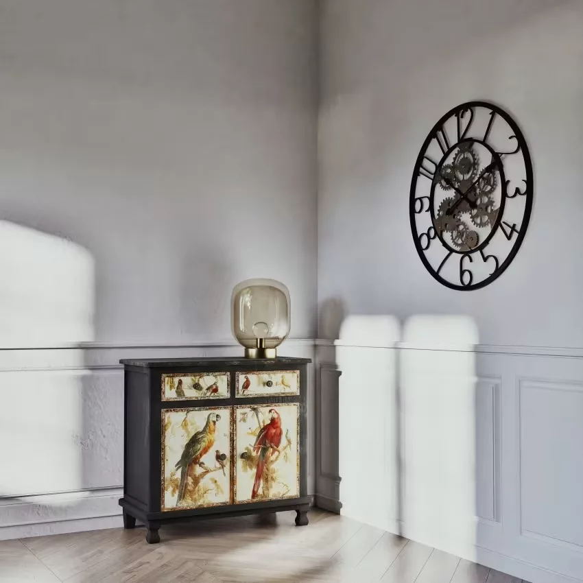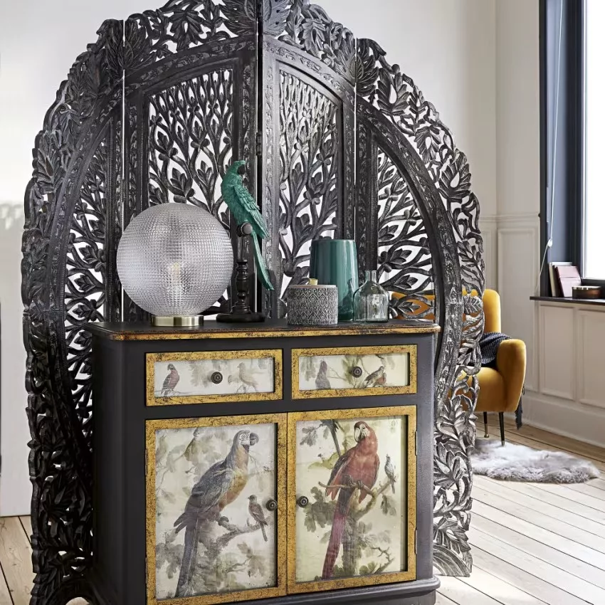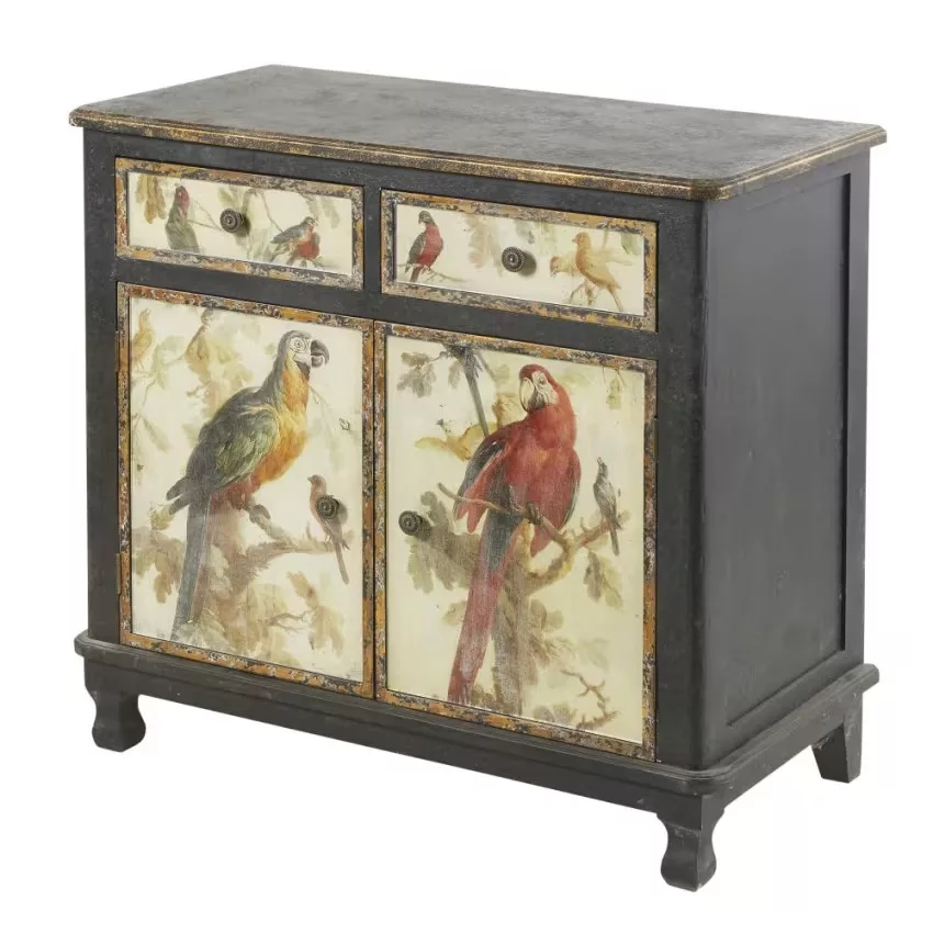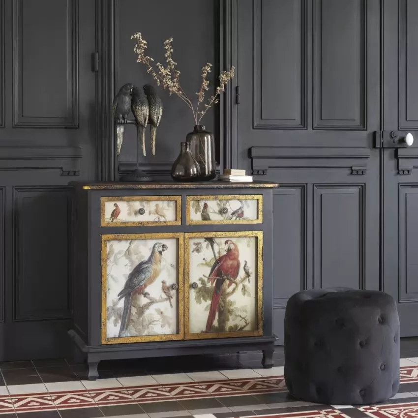 Faites dans l’originalité avec le buffet 2 portes 2 tiroirs noirs et imprimé perroquets !