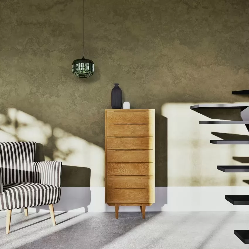 Le style vintage a encore de beaux jours devant lui avec le Chiffonier PORTOBELLO ! Sa ligne particulière et son coloris chêne doré lui donnent un style particulièrement rétro. Dans ses 7 tiroirs, vous pourrez ranger vos objets précieux, vos papiers, du textile… tout est permis dans ce petit meuble de rangement qui aura parfaitement sa place dans le séjour, le bureau ou même la chambre ! Qu’en pensez-vous ?