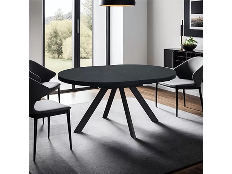 Matière : plateau et rallonges en panneaux de particules avec revêtement en céramique de 6mm effet marbre noir et pieds en métal thermosoudés