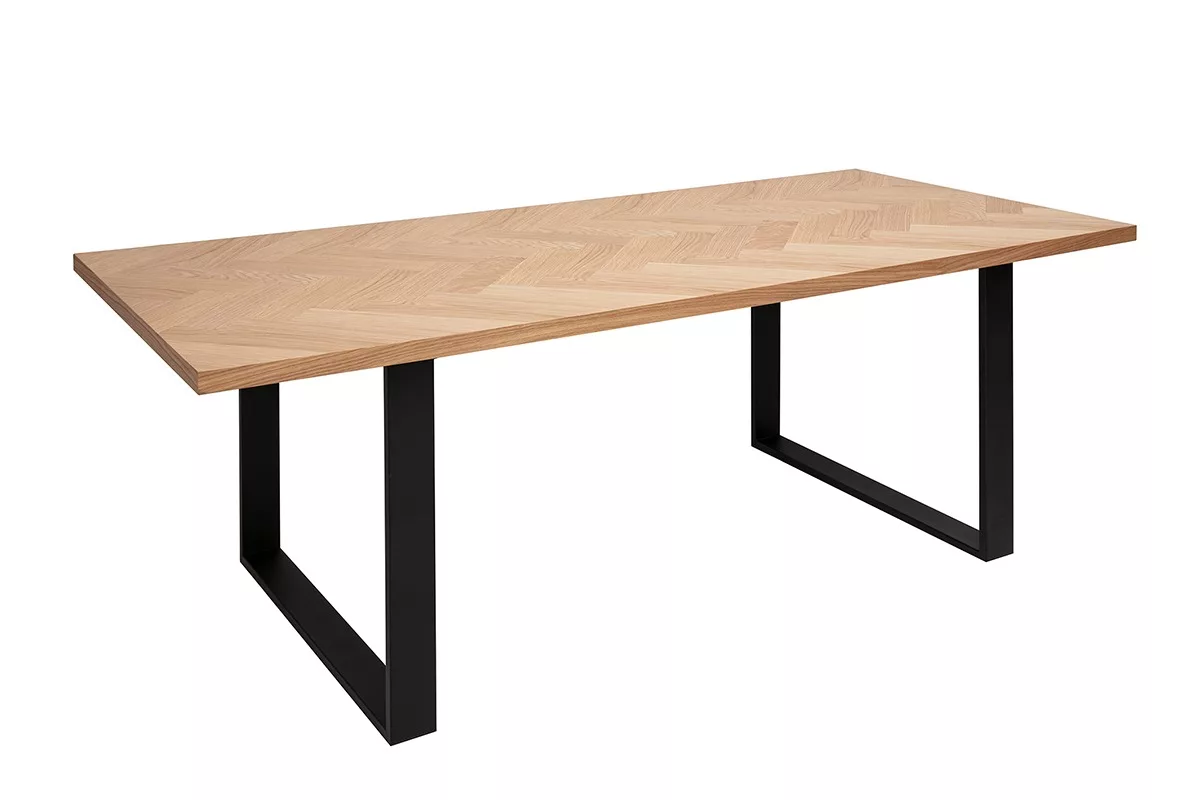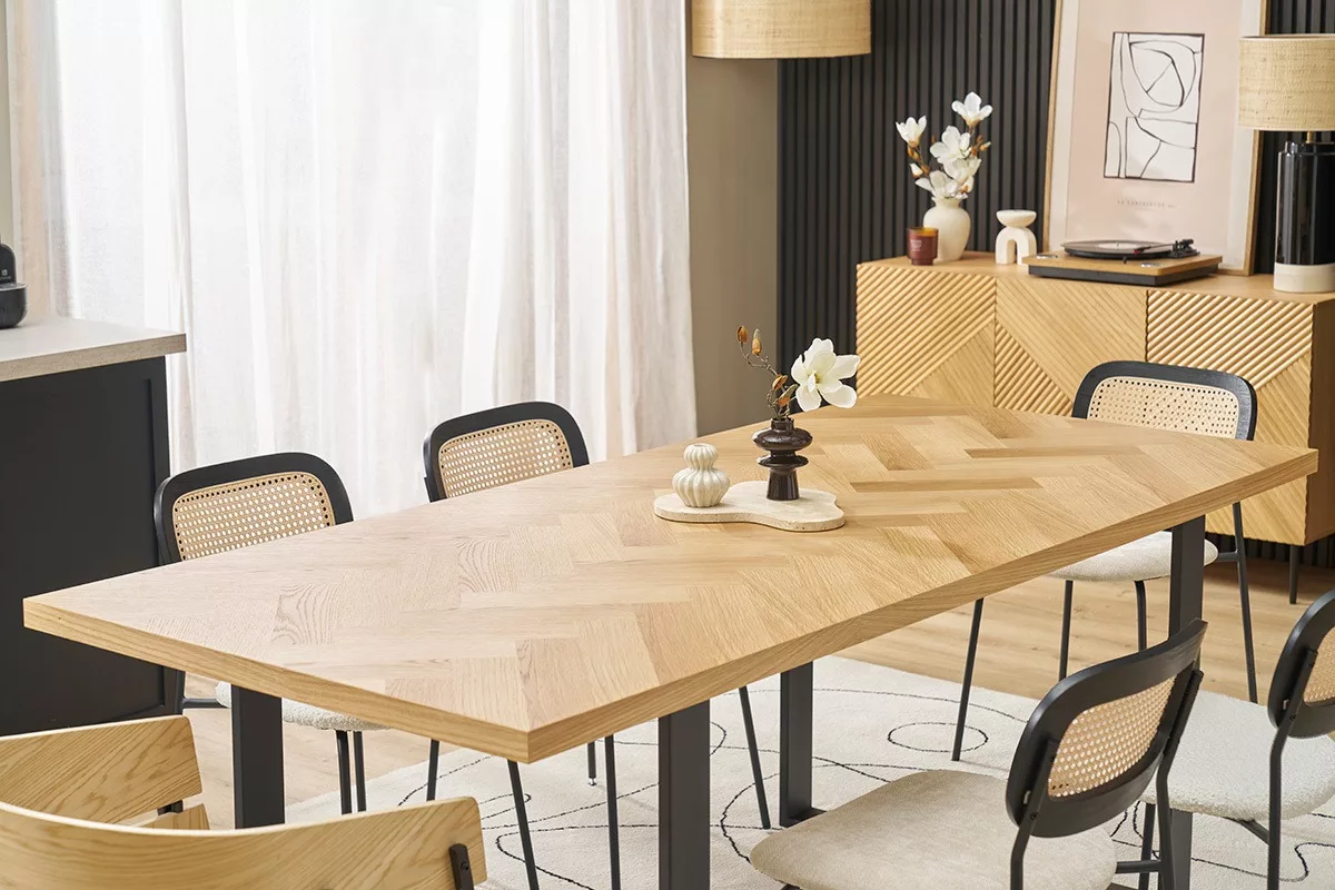 La MAGDA séduit par son plateau finition bois chêne clair, sublimé par un motif en chevrons qui apporte une touche graphique et chaleureuse à votre intérieur. Le veinage apparent et la teinte du bois confèrent à cette table une allure authentique et contemporaine. Sa surface généreuse (L200 x P90 cm) permet de disposer facilement plats, vaisselle et décoration sans jamais manquer de place.