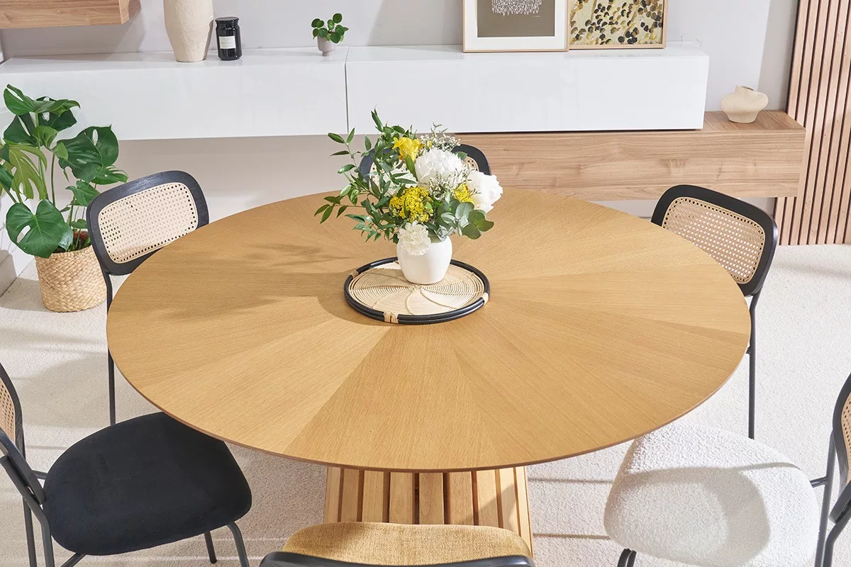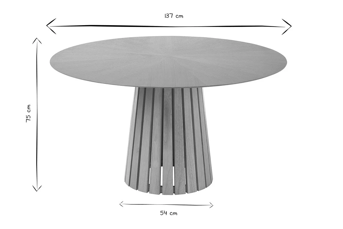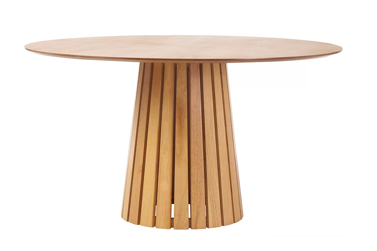 Au-delà de son esthétique remarquable, cette table ronde repose sur un piètement central au design sculptural. Réalisé en hévéa massif, ce pied conique à lattes verticales apporte une touche architecturale audacieuse et assure une parfaite stabilité. Il libère l’espace sous la table, offrant un confort optimal pour les convives tout en affirmant une silhouette élancée et moderne.