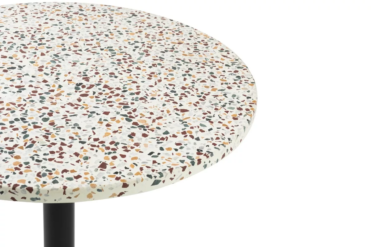 Le plateau en terrazzo est d’ailleurs la pièce maîtresse de ce modèle. Composé d’un mélange minéral moucheté aux nuances naturelles, il offre un rendu unique, à la fois raffiné et authentique. Chaque plateau présente ainsi de légères variations visuelles qui renforcent son charme moderne. Le terrazzo est également apprécié pour sa robustesse et sa stabilité, parfaitement adaptées à un usage quotidien.