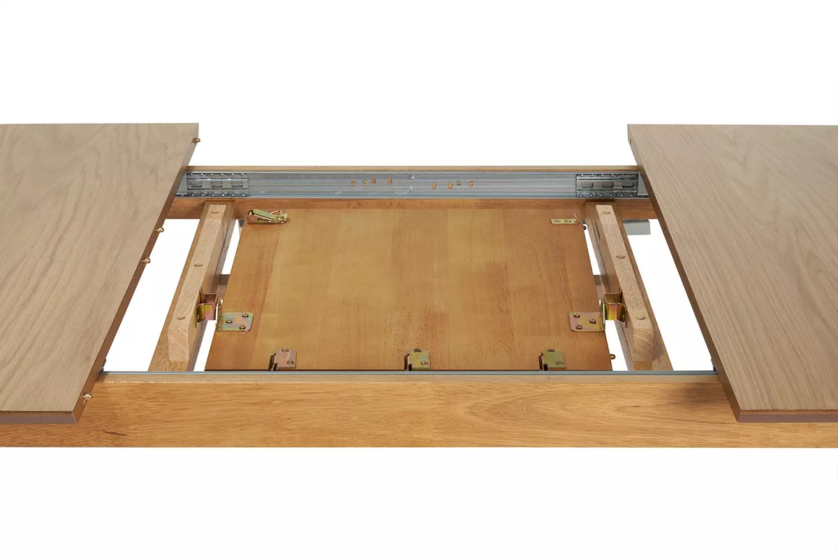 Belle et fonctionnelle. Pièce centrale de vos prochaines réunions de famille et moments de partage entre amis, cette table à manger extensible 6-8 couverts composée d’un plateau placage chêne et soutenue par un piètement en hévéa massif va rapidement se rendre indispensable ! Sans effort, il suffit de séparer le plateau en deux pour laisser dévoiler l’allonge papillon.