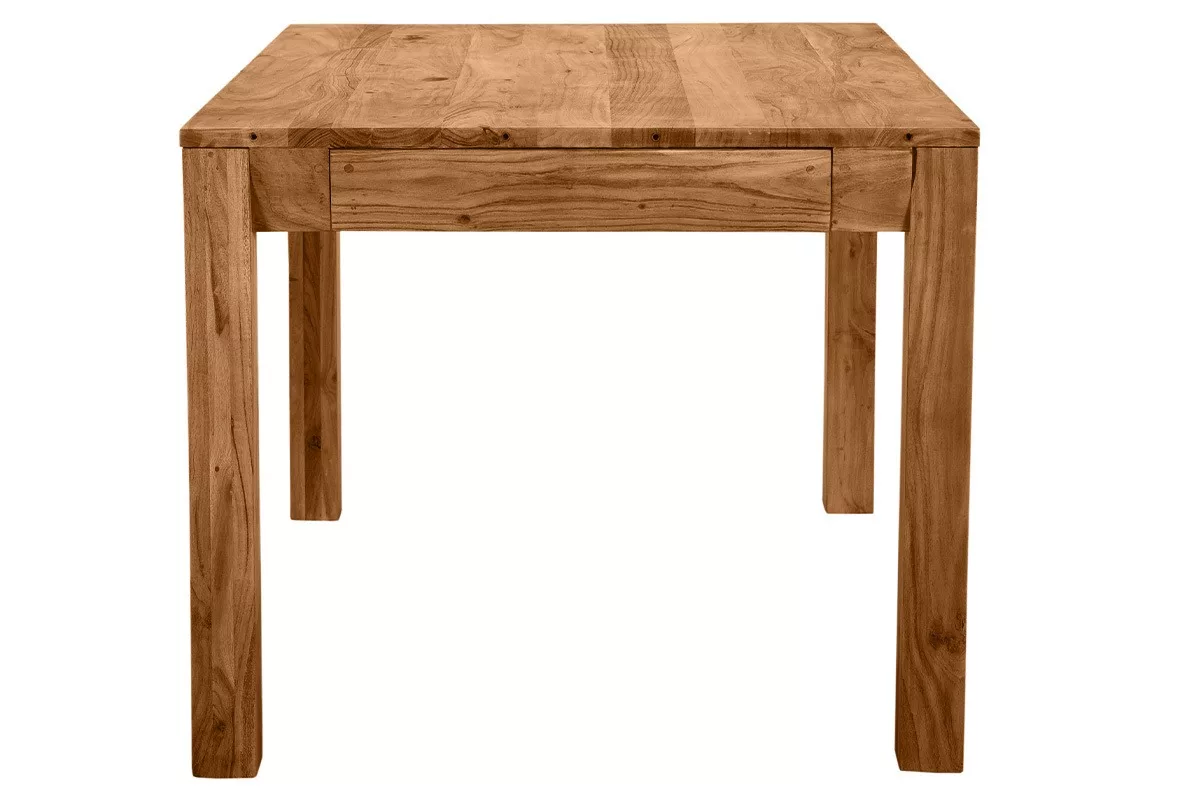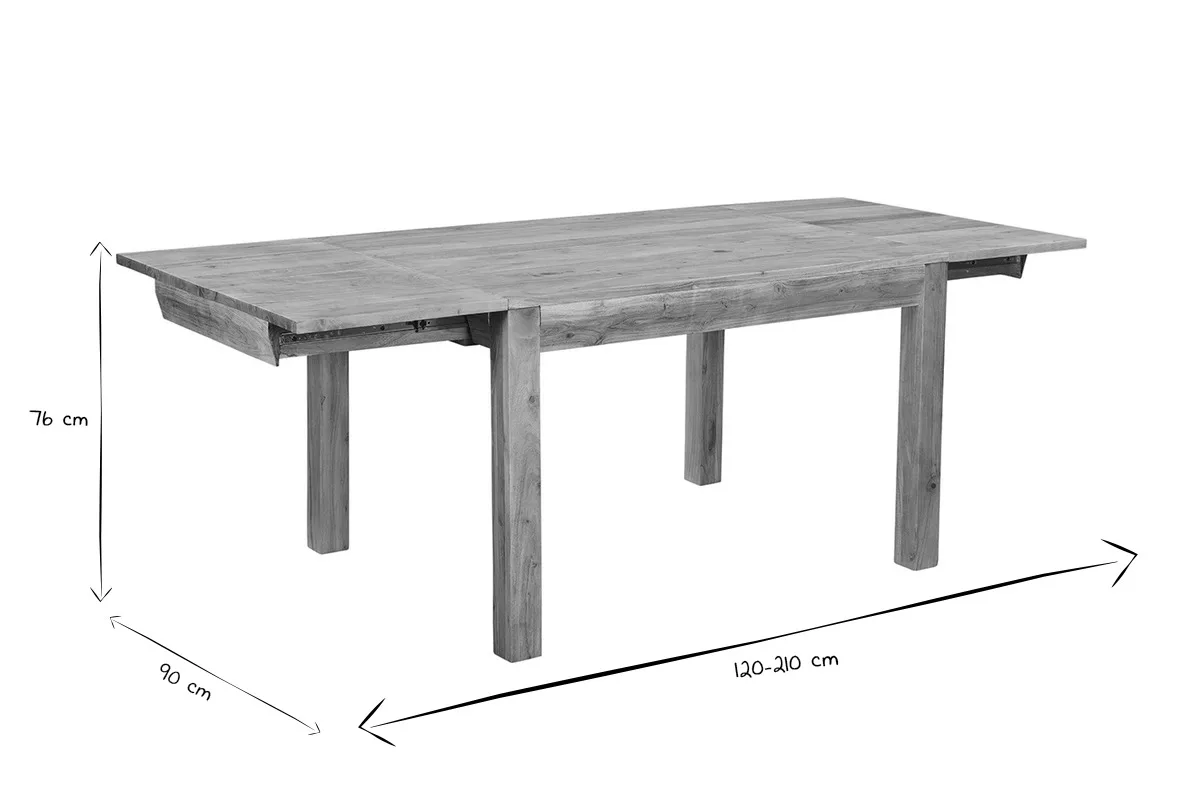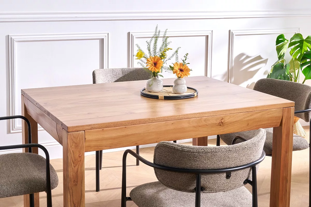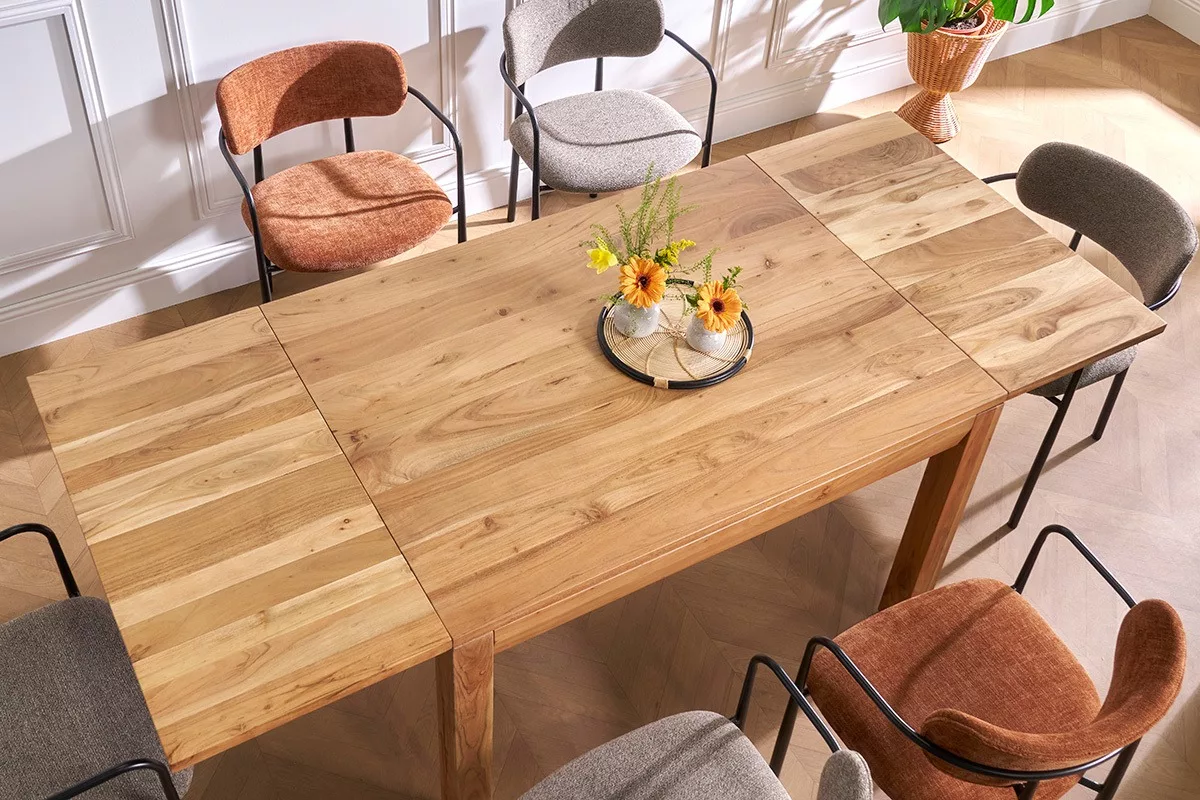 Meuble massif et majestueux, cette table extensible de repas en bois massif deviendra la pièce maîtresse d’un séjour ou d’une salle à manger. C’est une table de caractère, créée selon un savoir-faire artisanal. Les techniques utilisées pour sa conception offrent un rendu brut et authentique qui fait tout son charme. Plébiscitée pour la confection de mobilier d’intérieur, l’acacia est une essence naturellement dure et dense particulièrement esthétique. Ce bois imputrescible, se distingue par ses veinures allongées, mais également ses variations de couleurs. Avec le temps, l’exposition à la lumière et sources de chaleur, l’acacia est un bois clair dont le coloris jaune-vert à doré subit une coloration naturelle (brune, rougeoyante, reflets gris).