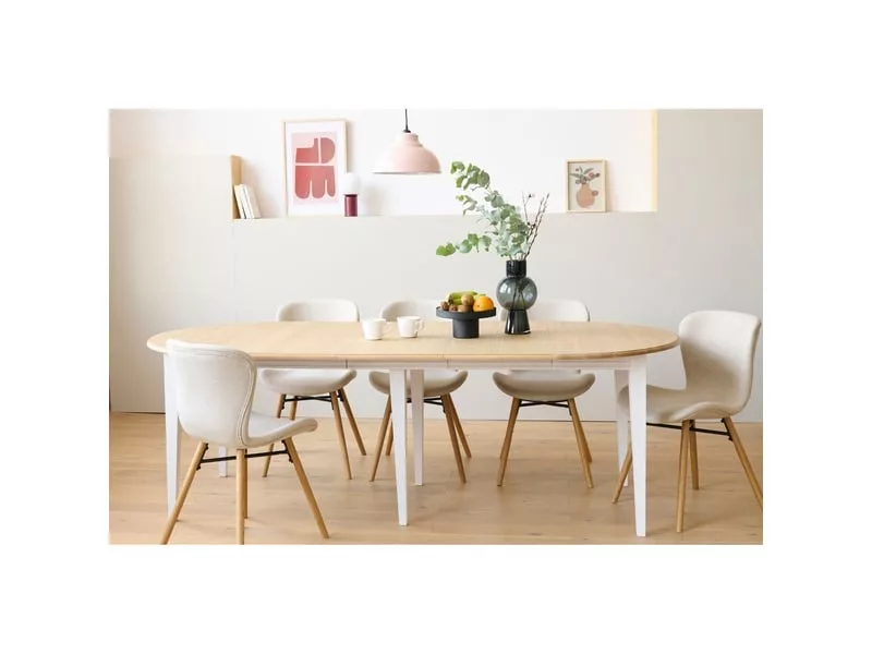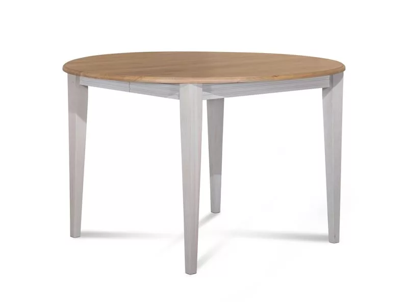 • Table ronde aux pieds fuseau en chêne massif avec allonge centrale.