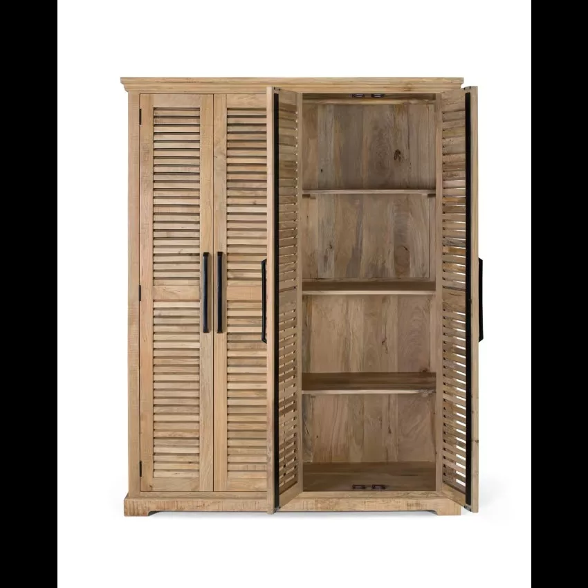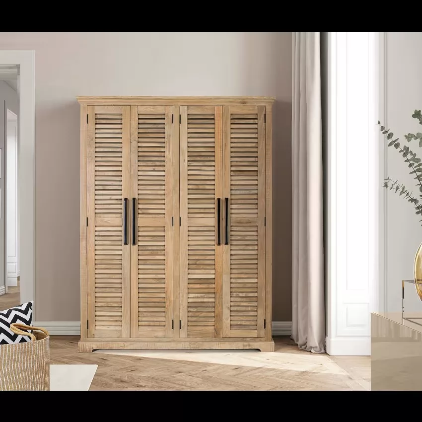 Cette imposante armoire en bois de manguier massif offre un espace de rangement généreux avec ses 4 portes, ses barres de suspension des deux côtés et ses étagères supérieures et inférieures réglables. Le bois naturel utilisé peut présenter des nœuds et un grain d’origine, ajoutant une touche d’authenticité à la pièce. Mesurant 190 cm de hauteur, 150 cm de longueur et 50 cm de largeur, cette armoire offre à la fois fonctionnalité et esthétique. Pesant 108 kg, elle est soigneusement emballée dans une boîte de dimensions 195x155x55 cm, prête à être utilisée sans nécessiter d’assemblage. TRÈS IMPORTANT! PRODUIT ASSEMBLÉ! Avant de procéder à l’achat, nous vous recommandons fortement de vérifier les dimensions des entrées de votre maison ou de votre chambre, ainsi que l’espace disponible dans la cage d’escalier et la dimension de l’ascenseur, le cas échéant. Cela garantira que les meubles sélectionnés pourront être transportés et installés sans accroc. Votre collaboration est essentielle pour une expérience d’achat satisfaisante! Étant donné qu’il s’agit d’un meuble en bois naturel et fabriqué à la main, il peut conserver ses nœuds et ses veines d’origine et peut donc présenter des différences en ce qui concerne la couleur.
