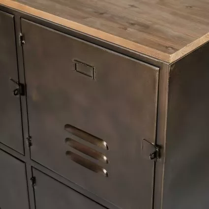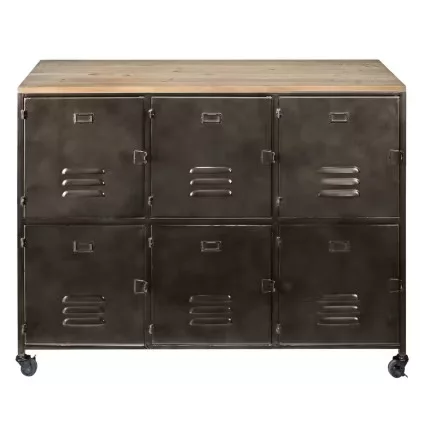 Buffet industriel à roulettes 6 portes en métal et bois de sapin L119