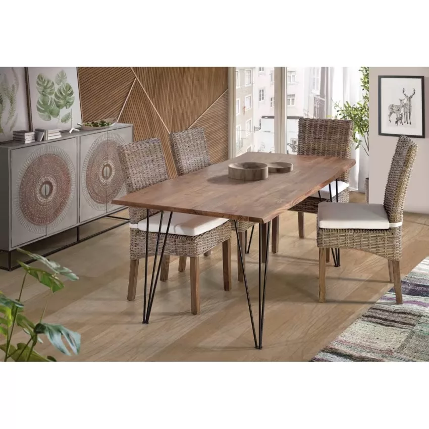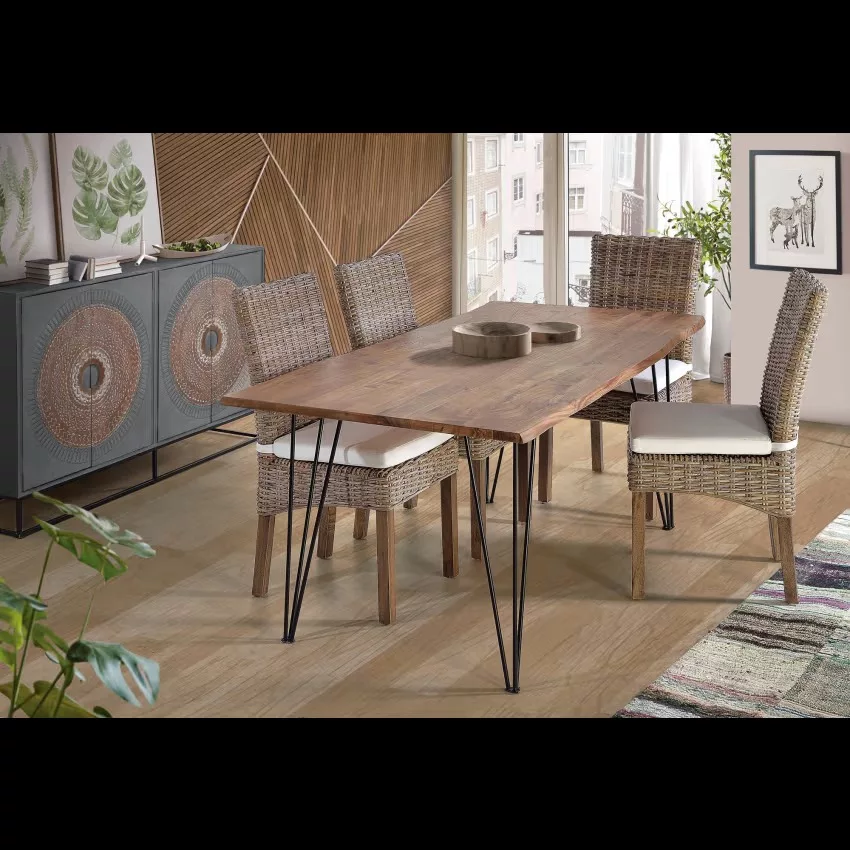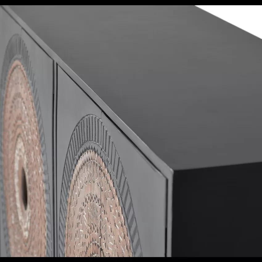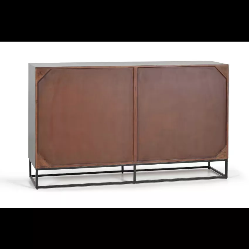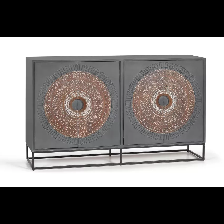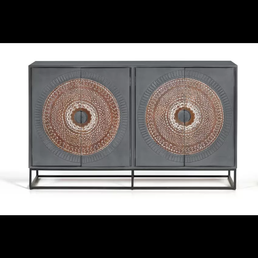 Buffet 4 portes en bois de manguier et piètement en métal, avec détails sculptés à la main. – dimensions de la porte : 71 x 35 cm – hauteur des étagères intérieures : 40 et 30 cm – hauteur des pieds : 16 cm Étant donné qu’il s’agit d’un meuble en bois naturel et fabriqué à la main, il peut conserver ses nœuds et ses veines d’origine et peut donc présenter des différences en ce qui concerne la couleur.