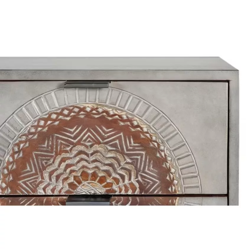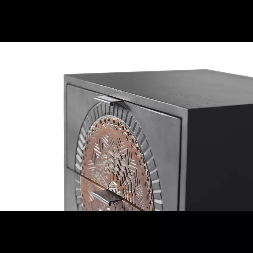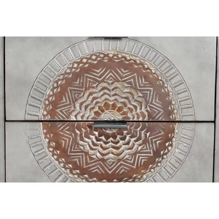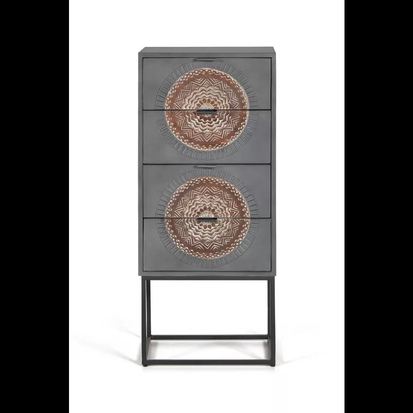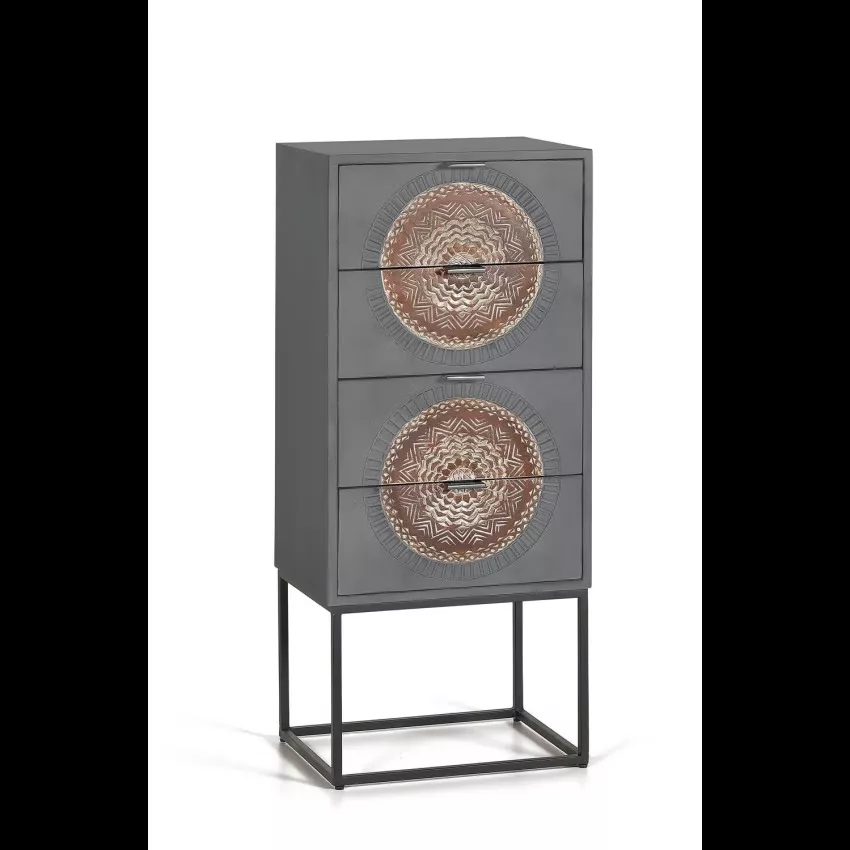 Sinfonier 4 tiroirs en bois de manguier et base en métal, avec détails sculptés à la main. – Mesures totales : 105 cm de haut X 45 cm de large X 35 cm de profondeur. Dimensions façade du tiroir : 17 x 42 cm – Dimensions intérieures du tiroir : 12 x 36 x 29 cm – Hauteur des pieds : 31 cm. Volume 0.16m3. Poids 27 kg. Étant donné qu’il s’agit d’un meuble en bois naturel et fabriqué à la main, il peut conserver ses nœuds et ses veines d’origine et peut donc présenter des différences en ce qui concerne la couleur.