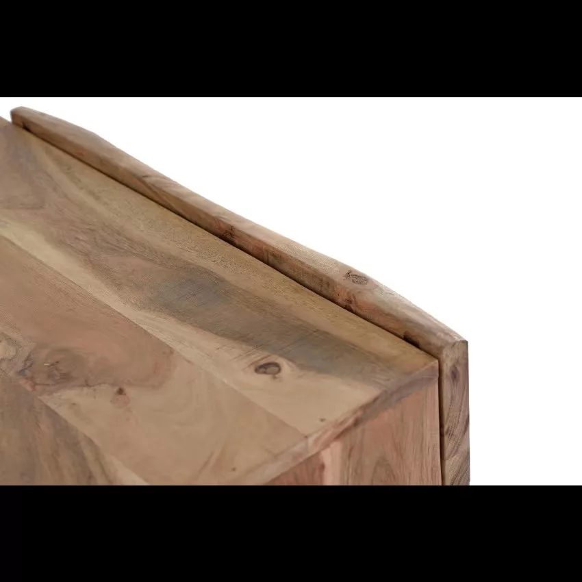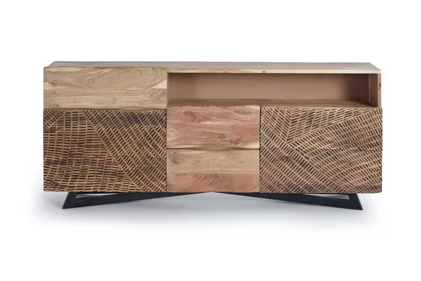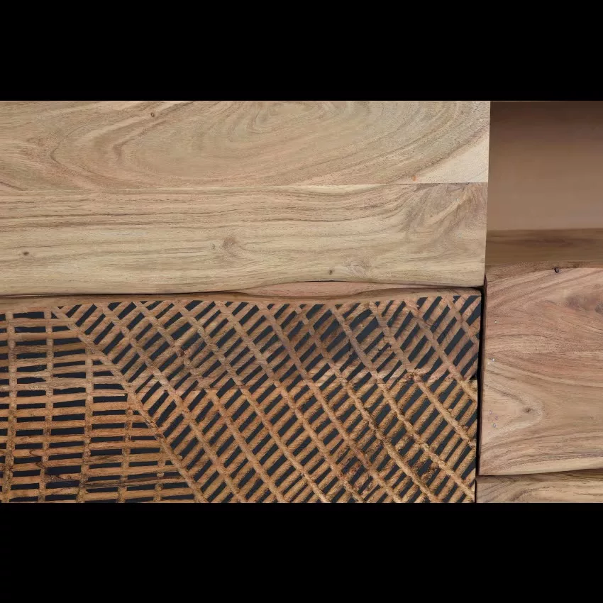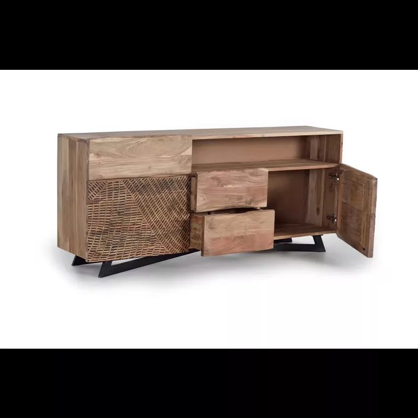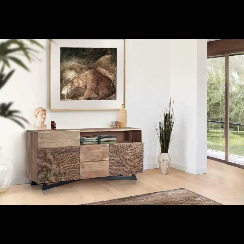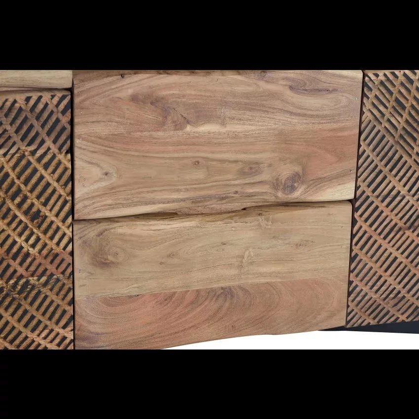 Buffet avec 2 portes et 3 tiroirs en bois d’acacia et piètement en métal, façade sculptée à la main. mesures de la façade des tiroirs : 21 x 44 cm. dimensions intérieures des tiroirs : 14 x 40 x 27cm. taille de la porte : 40 x 58 cm. hauteur des étagères : 17cm. hauteur des pieds : 10cm. Étant donné qu’il s’agit d’un meuble en bois naturel et fabriqué à la main, il peut conserver ses nœuds et ses veines d’origine et peut donc présenter des différences en ce qui concerne la couleur.